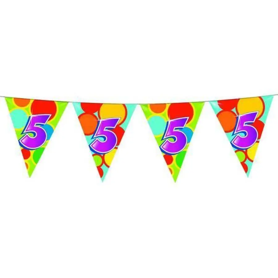 Deze mag eigenlijk niet ontbreken op een 5e verjaardag feestje. Deze vrolijk gekleurde vlaggenlijn bedrukt met het cijfer 5 geeft namelijk meteen een feestelijke uitstraling. Combineer hem met wat 5 jaar ballonnen en het feestje kan al beginnen. Bekijk hier onze grote collectie aan kinderverjaardag versiering. Maak er een onvergetelijk 5e verjaardag van.