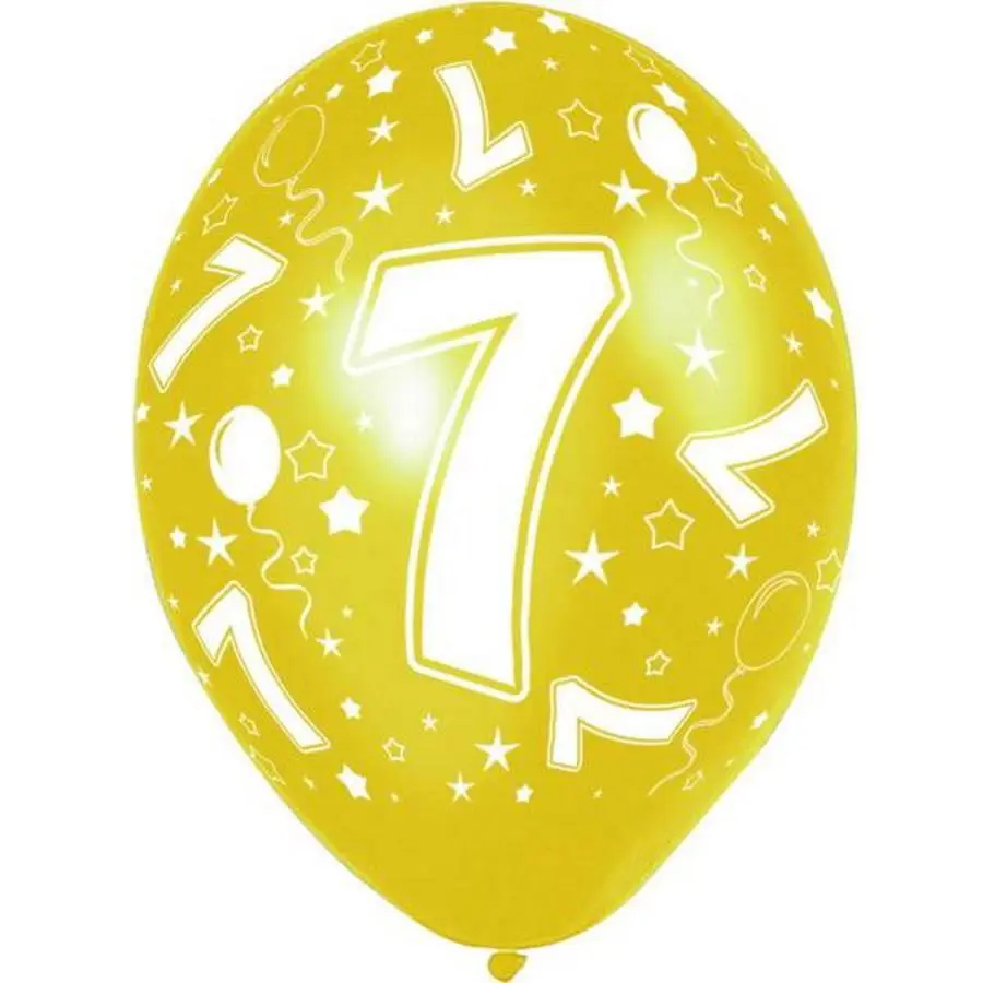 5 gekleurde metallic ballonnen bedrukt met het cijfer 7