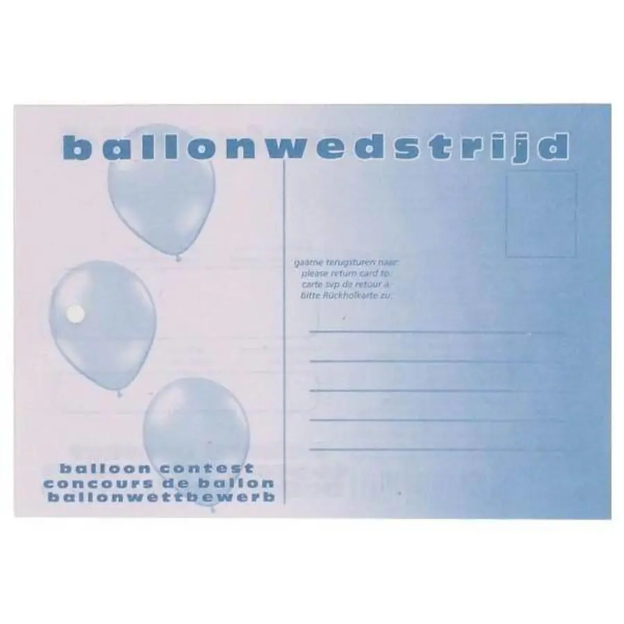 Een ballonkaartje met verschillende talen beschreven, zodat de vinder ook in het buitenland het kaartje kan terugsturen.