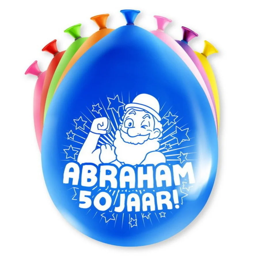 Een zakje met 8 goede kwaliteit ballonnen bedrukt met de tekst Abraham 50 jaar. Doorsnede: 30cm.