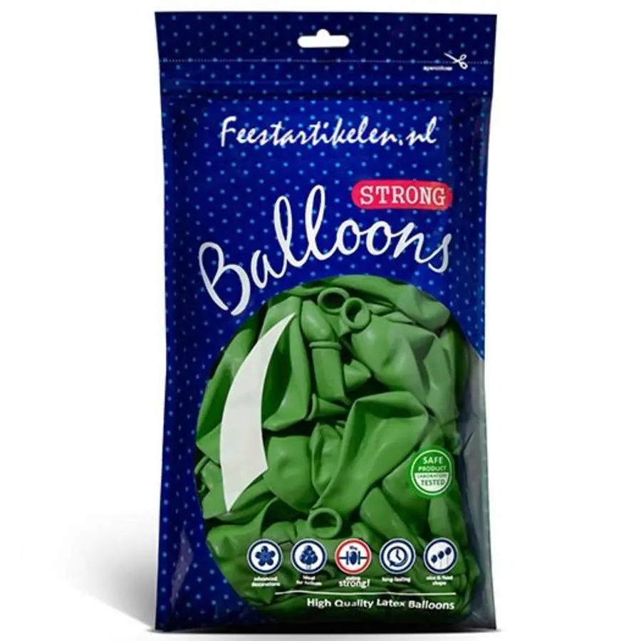 Een zak met 100 STERKE groene ballonnen in een normaal formaat (27cm doorsnee). Deze STERKE ballonnen zijn ook geschikt om met helium te vullen. De vliegduur van deze ballonnen met helium is ca. 10 tot 12 uur. Als de ballon is opgeblazen heeft deze de juiste kleur.