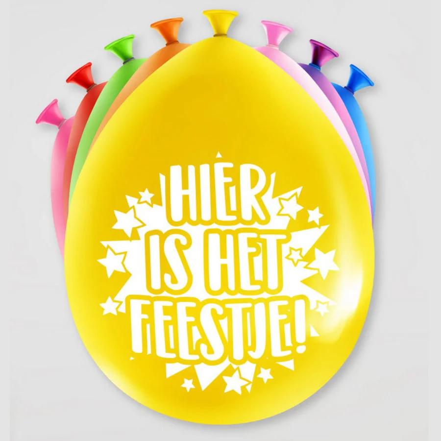 Een zakje met 8 ballonnen bedrukt met de tekst: Hier is het feestje. Mooie duidelijke bedrukking. Doorsnede: 30cm. Perfect voor elk themafeest en verjaardagen. In de kleuren geel, blauw, lichtroze, donkerroze, rood, oranje, paars en groen.