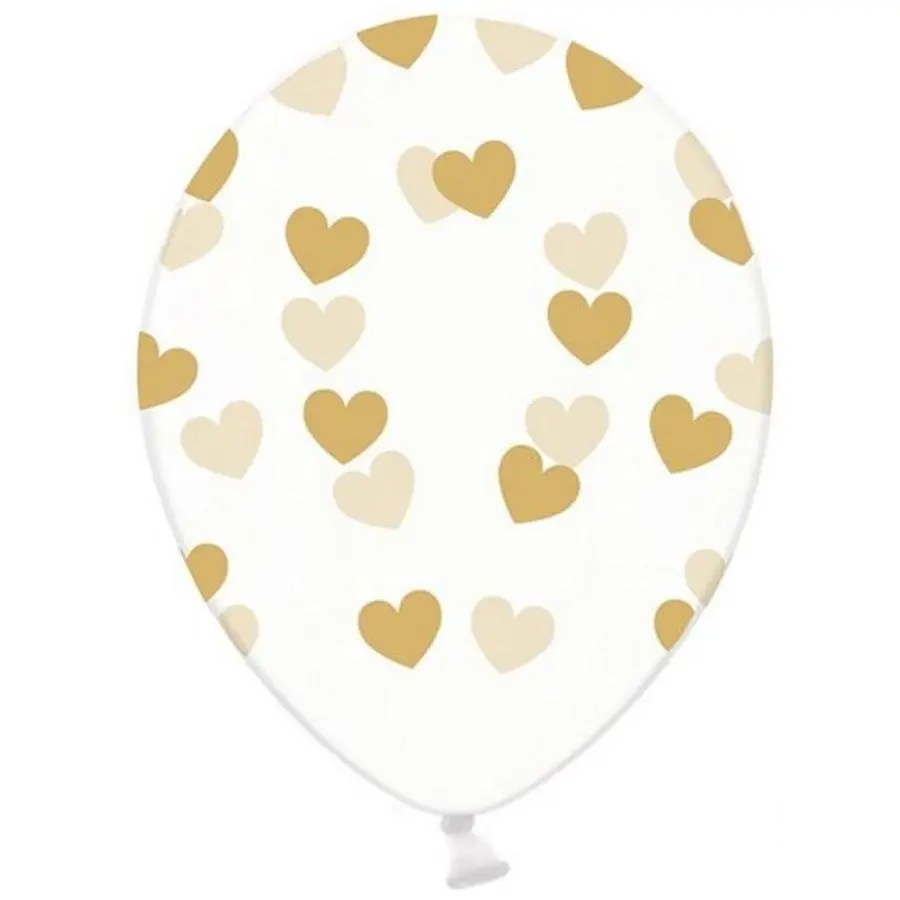 Een pakje met 6 extra sterke doorzichtige ballonnen bedrukt met goudkleurige hartjes. Doorsnede: 30cm. Prachtige stijlvolle ballonnen.