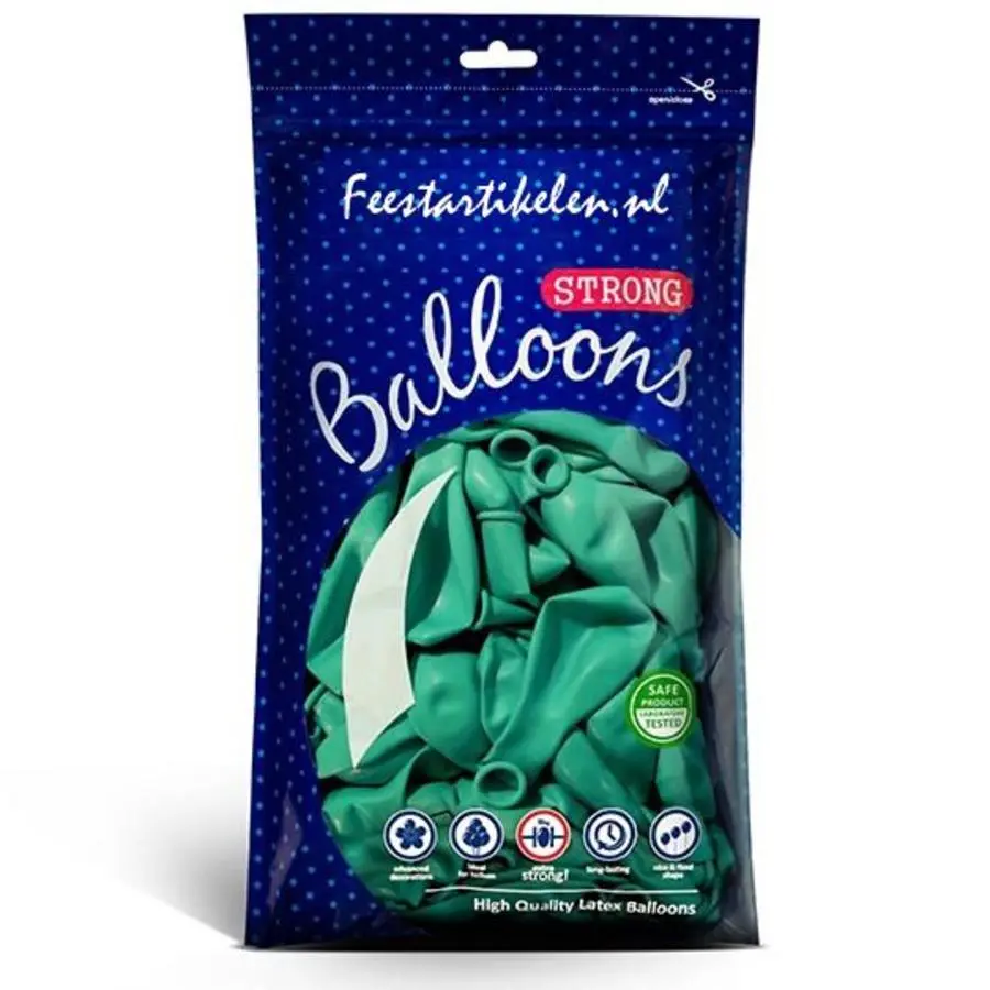 Een zak met 100 STERKE zeegroene ballonnen in een normaal formaat (27cm doorsnee). Deze STERKE ballonnen zijn ook geschikt om met helium te vullen. De vliegduur van deze ballonnen met helium is ca. 10 tot 12 uur. Als de ballon is opgeblazen heeft deze de juiste kleur.