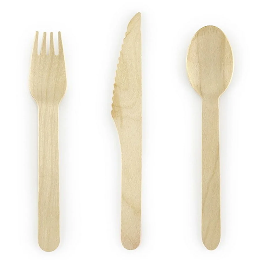 Een pakje houten milieuvriendelijk bestek. Inhoud: 6 lepels, 6 vorken en 6 messen. Lengte: 16cm.