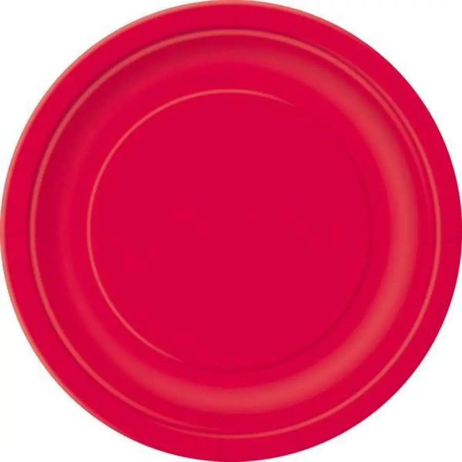 Een set met 8 stevige papieren rode borden met een doorsnede van 22.2cm. Perfect voor themafeesten in een specifieke kleur.