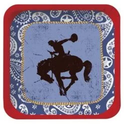 Een pakje met 8 kleine kartonnen bordjes bedrukt in western stijl. Met deze specifieke Wild West bordjes komt u onmiddellijk in de juiste sfeer. Perfect voor Western themafeesten. Doorsnede: 17.4cm.
