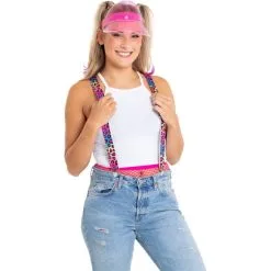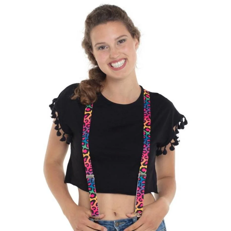 Een paar bretels bedrukt met een luipaard print in neon-fluor kleuren. Leuk voor dames en heren. Let op – De kleuren zijn iets minder fel dan op de digitale foto’s.