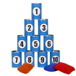 Het klassieke kermisspel, nu voor in je eigen tuin. De blikjes en werpzakjes met korrelvulling zijn van zware kwaliteit en gaan lang mee! Inhoud: 12 blikjes (6 x 10 cm) en 3 werpzakjes. Wordt geleverd in full-colour doos met uitgebreide handleiding. Geschikt voor kinderen vanaf 3 jaar.