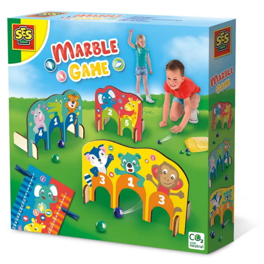 Knikkeren met uitdaging! Dit knikkerspel met houten poortjes en acht knikkers kan overal gespeeld worden. Van het schoolplein tot de woonkamer, jij kunt met de handige knikkerzak het spel overal starten. De houten poortjes kun jij overal neerzetten en zo je eigen baan vormen. Met de scorekaart en knijpers houd je eenvoudig bij wat jouw score is. Wie zal er winnen?