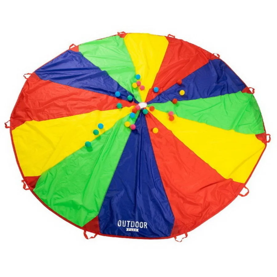 Outdoor Play Parachutedoek met ballen. Bij dit spel is het belangrijk dat je goed samenwerkt met je vrienden! Laat de ballen in de parachute stuiteren, maar zorg ervoor dat ze er niet uitvallen. Een vrolijk en leerzaam spel dat zorgt voor een hoop plezier! Dit buitenspeelgoed kan gespeeld worden tot wel 12 spelers. Werk samen om jou ballen als eerste door het gaatje te krijgen. Inhoud: 1 Parachute Ø300 cm en 24 gekleurde ballen. Zie extra foto’s!