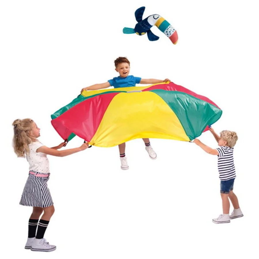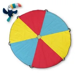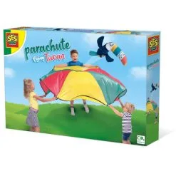 Wiehoeee, kijk hoe hoog de toekan vliegt! Probeer samen met je vriendjes en vriendinnetjes de toekan zo hoog mogelijk in de lucht te laten vliegen met deze kleurrijke speelparachute. Pas op dat de toekan niet op de grond valt! Met deze speelparachute met een diameter van maar liefst 2,5 meter verveel jij je nooit, want er zijn oneindig veel speelmogelijkheden. Te spelen met 2 tot 6 kinderen.