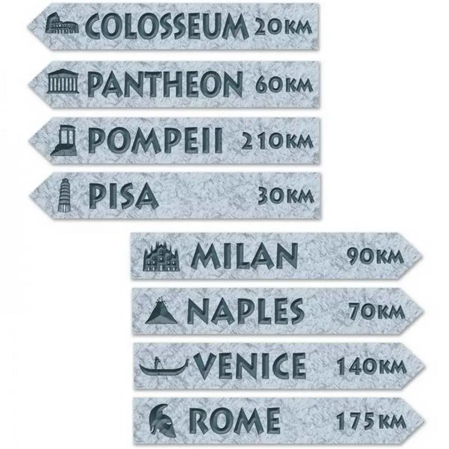 Vier Italiaanse Street Signs decoraties. Deze wegwijs borden zijn aan twee kanten verschillende bedrukt met in totaal 8 Italiaanse bezienswaardigheden/steden die u gezien moet hebben. Bijvoorbeeld Milaan, Pisa en Rome. Afmeting: 61 x 10cm. Perfect voor Italiaanse themafeesten.