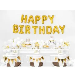 Een set met folieballonnen in de letters HAPPY BIRTHDAY. Afmeting: 340cm x 35cm. Leuke opvallende decoratie ballonnen om tijdens een verjaardag aan de wand te hangen.
