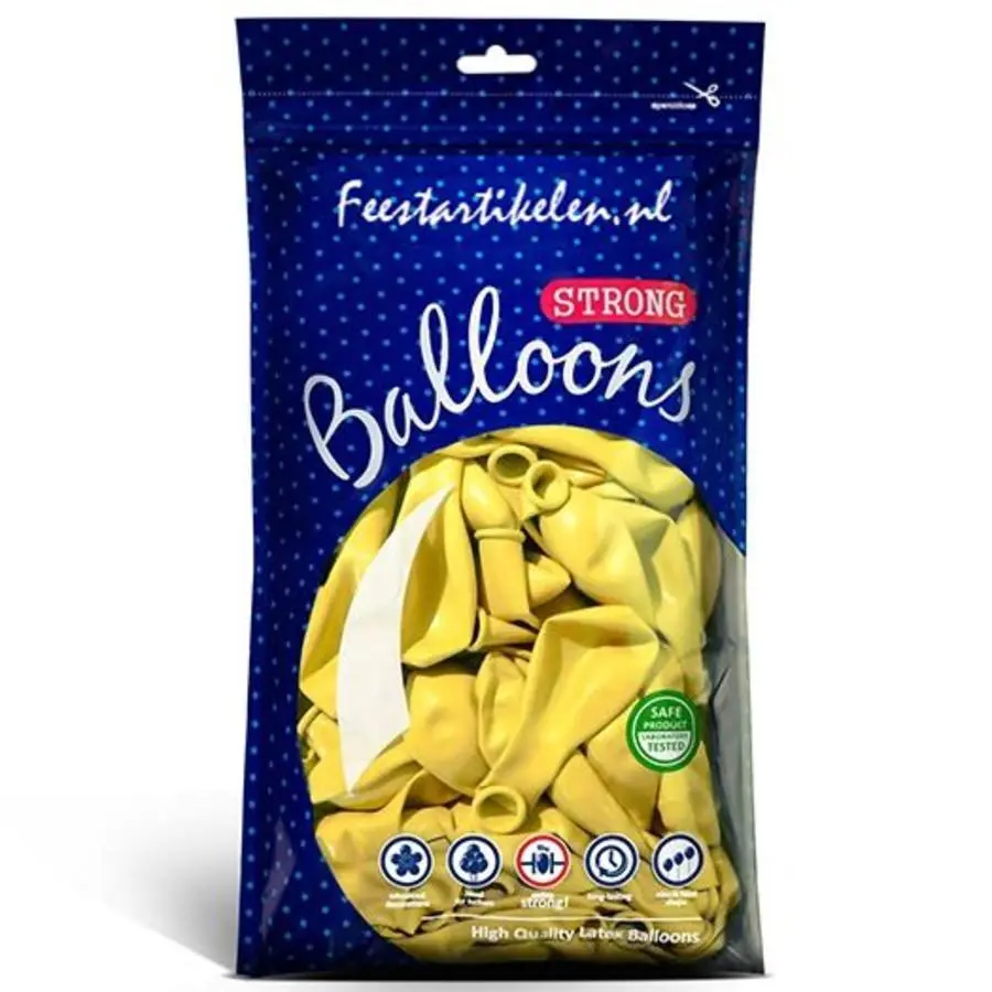 Een zak met 100 STERKE gele ballonnen in een normaal formaat (27cm doorsnee). Deze STERKE gele ballonnen zijn ook geschikt om met helium te vullen. De vliegduur van deze ballon met helium is ca. 10 tot 12 uur. Als de ballon is opgeblazen heeft deze de juiste kleur.
