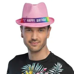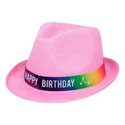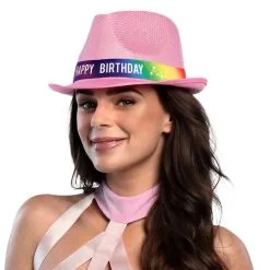 Een roze hoed met een bandje met de tekst Happy Birthday. One size, fits all. Leuk om aan iemand te geven die jarig is. Voor dames en heren. Zie extra foto’s.