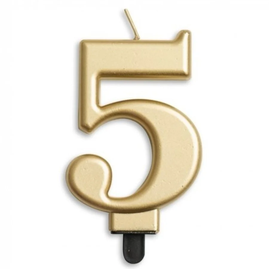 Een chique goudkleurige kaars in de vorm van het cijfer 5. Erg mooie luxe kaars! Hoogte: 7cm.