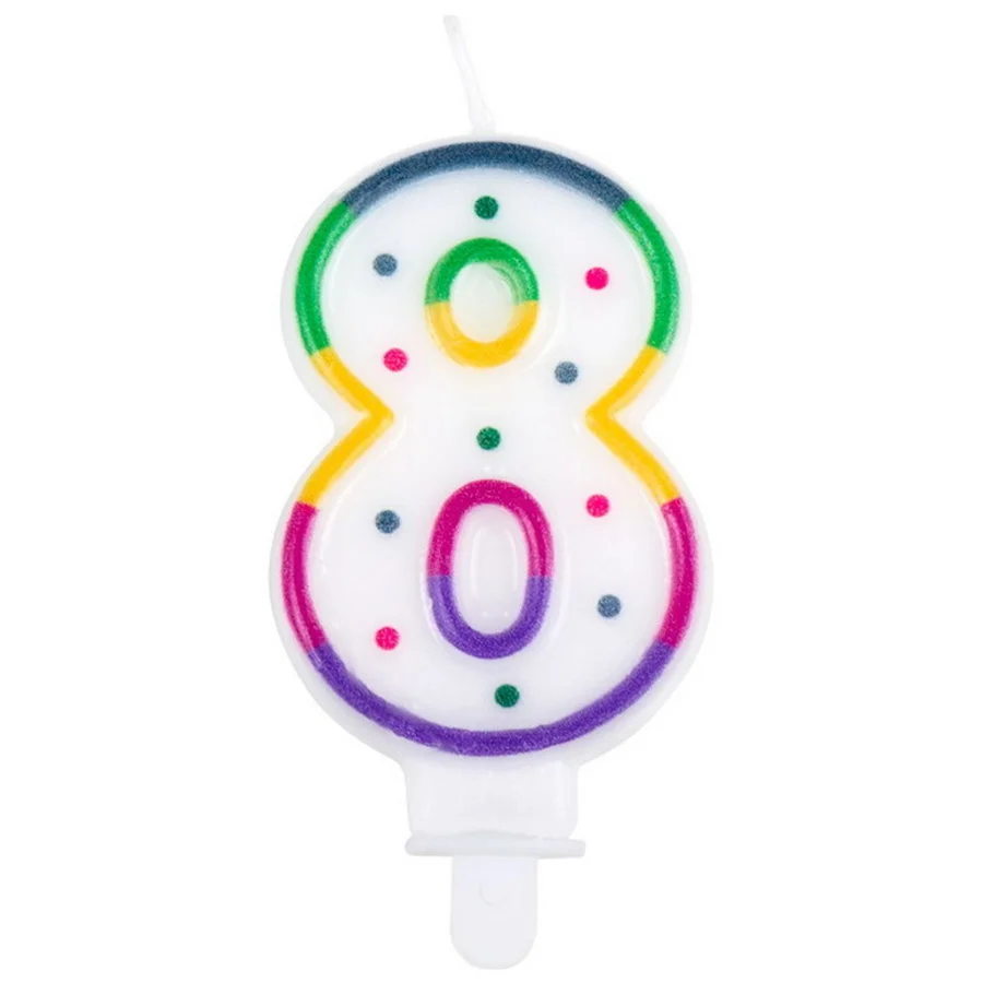 Zeg je verjaardag, zeg je taart! En vier je een eerste verjaardag feestje dan moet er natuurlijk ook een leuk kaarsje op de taart. Dan is deze 8 jaar verjaardagskaars erg leuk. Hij is uitgevoerd in de vorm van het cijfer 8 en heeft diverse kleuren, dus past overal bij. Combineer deze kaars met andere 8 jaar versieringen en het feest kan beginnen. Hoogte: 7.5cm.