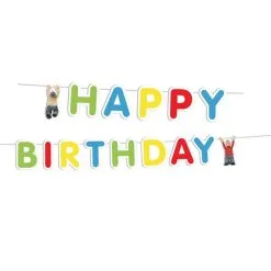 Een letterslinger in de tekst Happy Birthday met voor een achter de letters een hangende Buurman en Buurman. Lengte: 150cm. Superleuk voor een kinderverjaardag in het thema Buurman en Buurman.