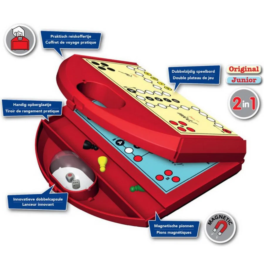 De originele klassieker Mens erger je niet. Breng als eerst de pionnen naar de thuisbasis en win. Maar pas op, want voor je het weet gooit iemand je van het bord af. Deze compacte versie wordt geleverd in een handig koffertje en neem je gemakkelijk overal mee naartoe. Door de compacte versie veel goedkoper, maar net zo leuk! In het koffertje zit de originele versie en een junior versie. Afmeting: 24 x 16 x 5 cm. Geschikt voor kinderen vanaf 4 jaar.