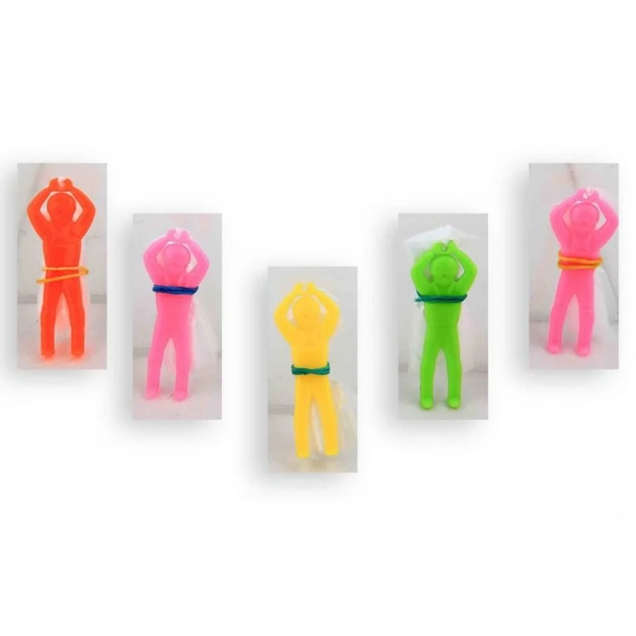 Twaalf plastic poppetjes met een parachute op de rug. Maak de parachute goed los en gooi het poppetje in de lucht en deze zweeft aan de parachute weer naar beneden. Nostalgies speelgoed! Leuk om mee te spelen of om aan kinderen te geven na afloop van een kinderfeestje. Ze worden geleverd in zoveel mogelijk verschillende kleuren. De afbeelding kan iets afwijken. Voor kinderen vanaf 4 jaar.