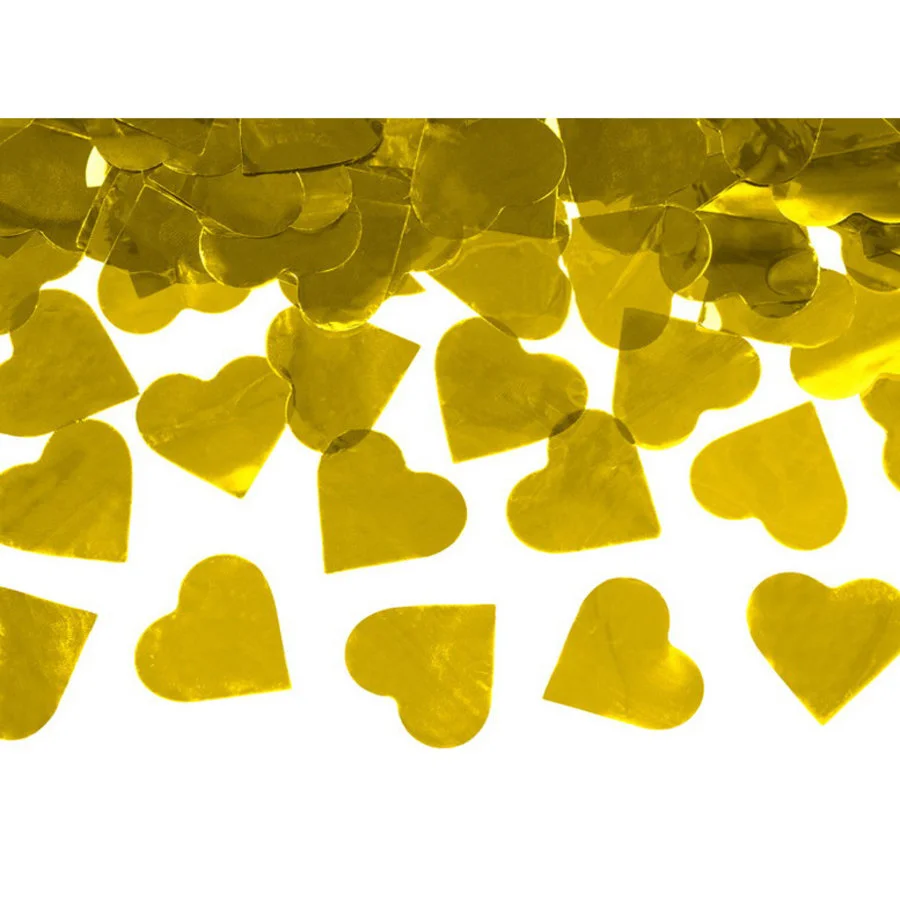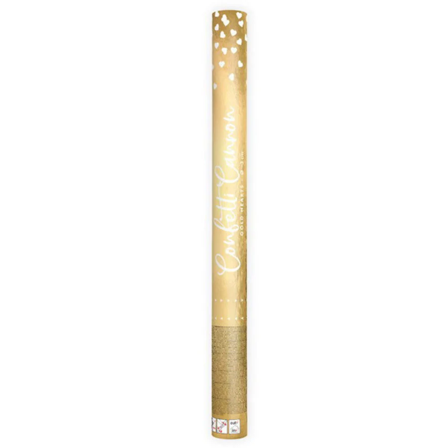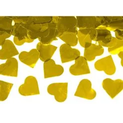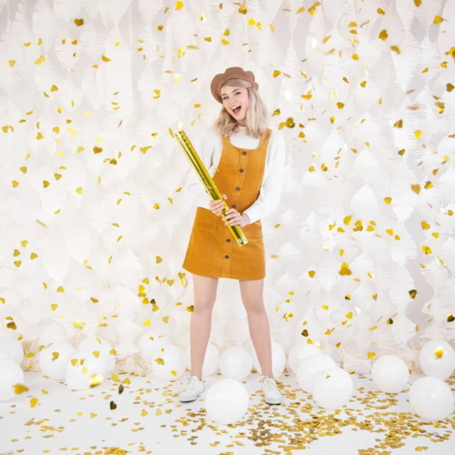 Een grote confetti bom met hartjes. Kleur: goud. Lengte: 60cm. Draai onderaan deze confetti bom en BOEM! Tip 1: Denk aan het milieu en ruim de hartjes ook weer op. Tip 2: Gebruik de hartjes na afloop als tafeldecoratie. Super sfeervol!