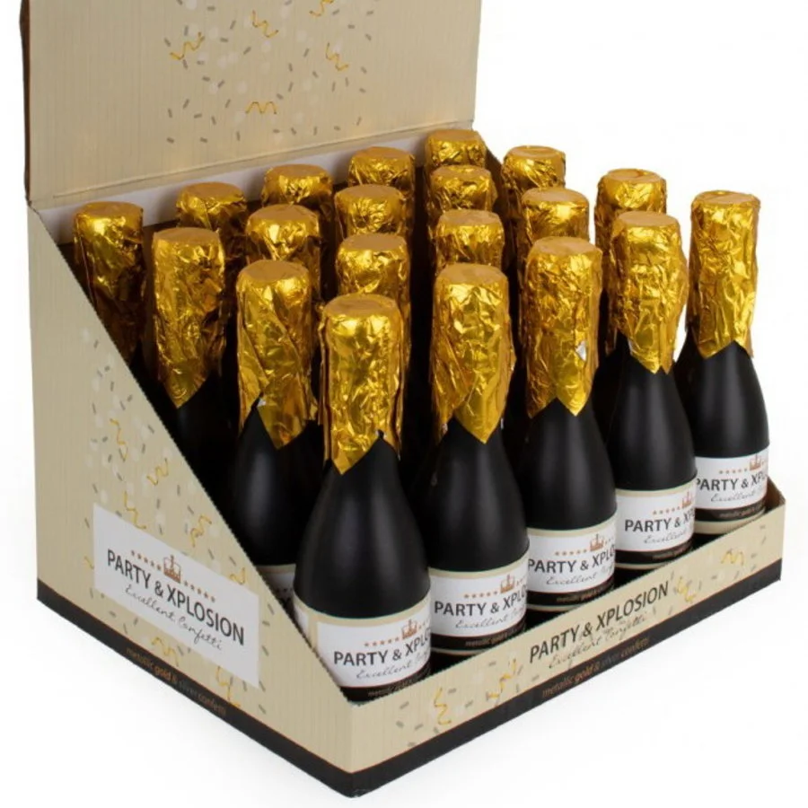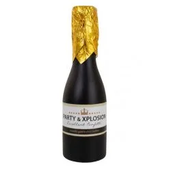 Een Party shooter in een feestelijke fles verpakking. Draai onderaan deze Party Popper en BOEM! Er knallen allemaal goudkleurige en zilverkleurige sliertjes en confetti uit. Super feestelijk! Hoogte: 20cm. Leuk voor bruiloften, verjaardagen, jubilea etc. Ook leuk voor oud en nieuw!