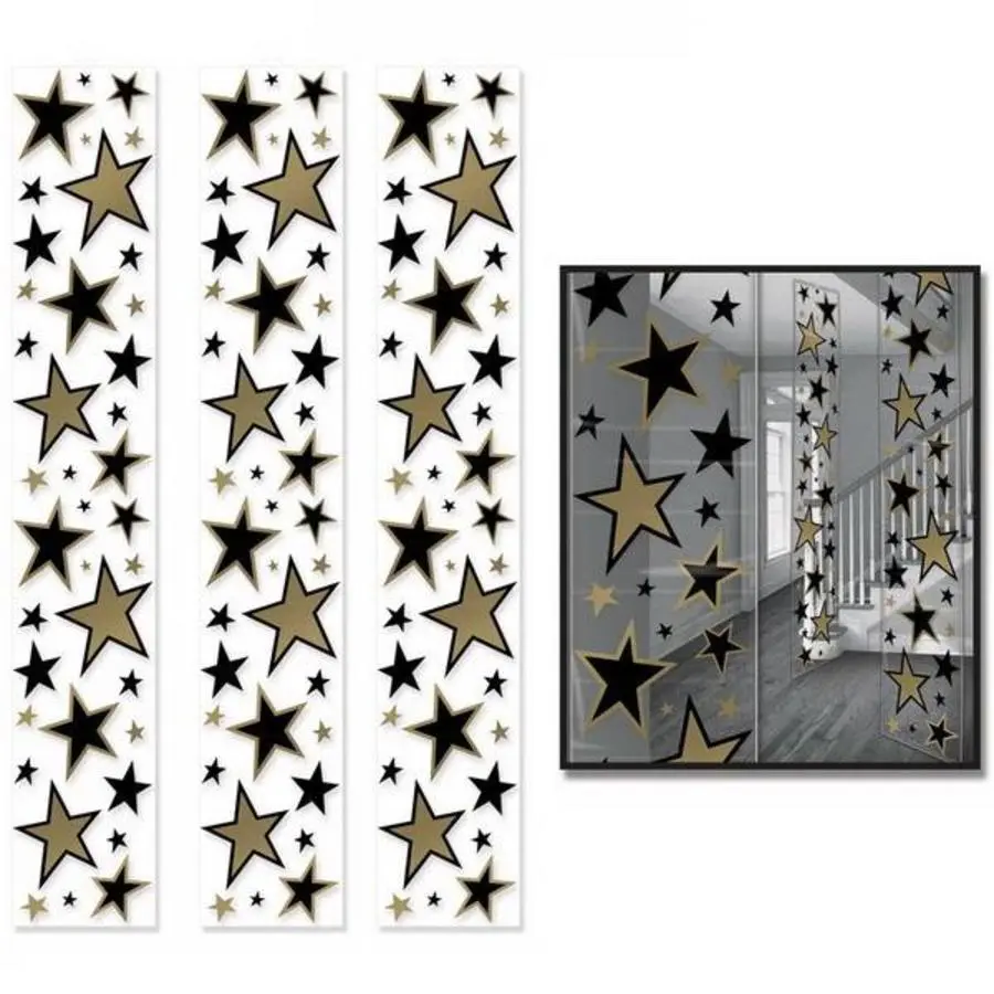 Deze Party Panels bestaan uit 3 lange doorzichtige stroken die bedrukt zijn met zwarte en goudkleurige sterren. Dit geeft het geheel een prachtige feestelijke en chique uitstraling. Afmeting: 30 x 180cm. Een nieuwe stijlvolle manier van versieren.