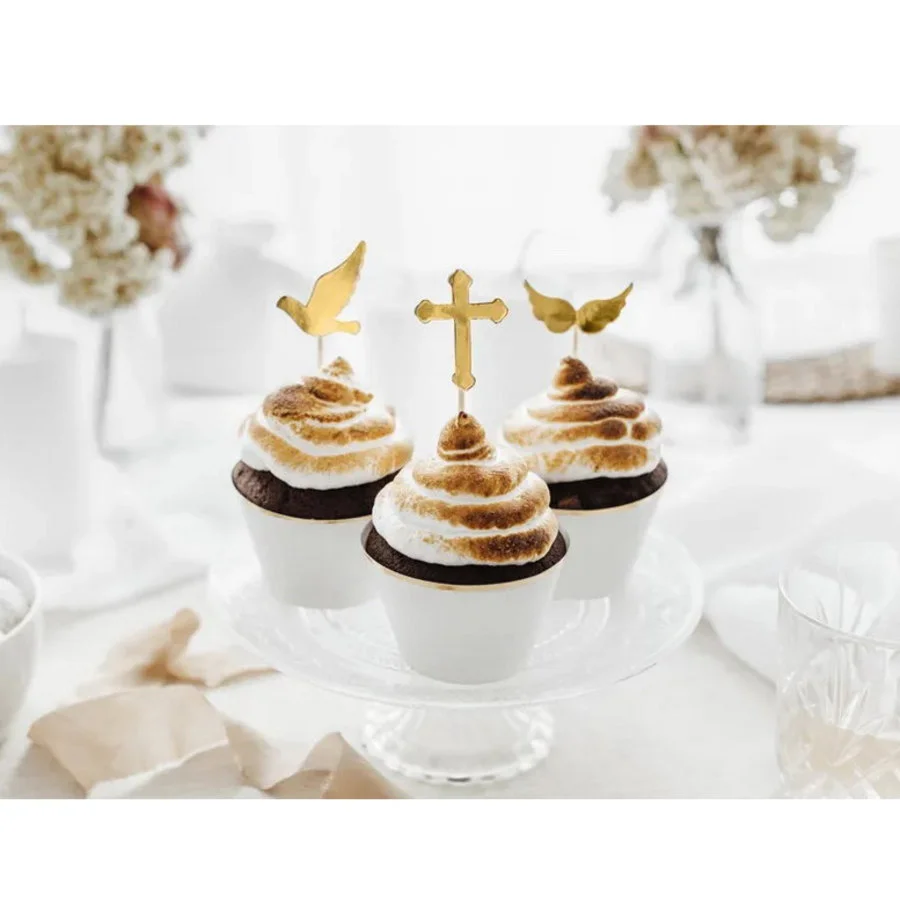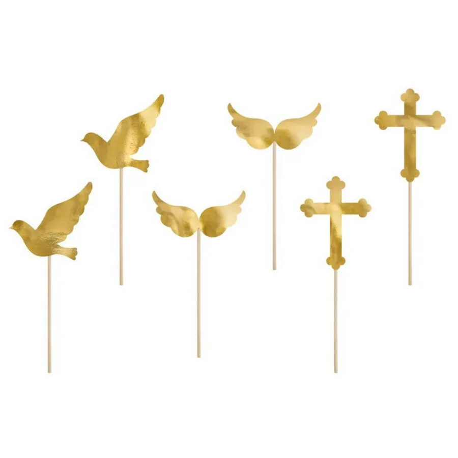Een pakje met 6 christelijke prikkers bestaande uit 2 kruizen, 2 duifjes en 2 engelenvleugels. Kleur: goud. Erg mooi en toepasselijk voor kerkdiensten, jongeren events, doopfeesten, verjaardagen of andere themafeesten. Hoogte: 11cm.