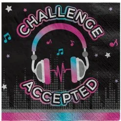Een pakje met 20 servetten bedrukt met een koptelefoon en de tekst Challenge Accepted. Superleuk voor een verjaardag in het thema social media. Vandaag bij jij de ster! Dit originele TikTok thema zal je veel likes opleveren. Afmeting: 32.7cm x 32.7cm.