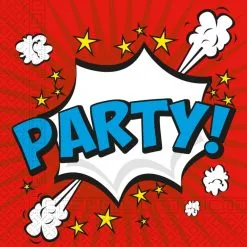 Een pakje met 20 servetten bedrukt in het thema superhelden in de kleuren rood en blauw. Afmeting: 33cm x 33cm. Superleuk voor een kinderverjaardag in het thema superhelden.