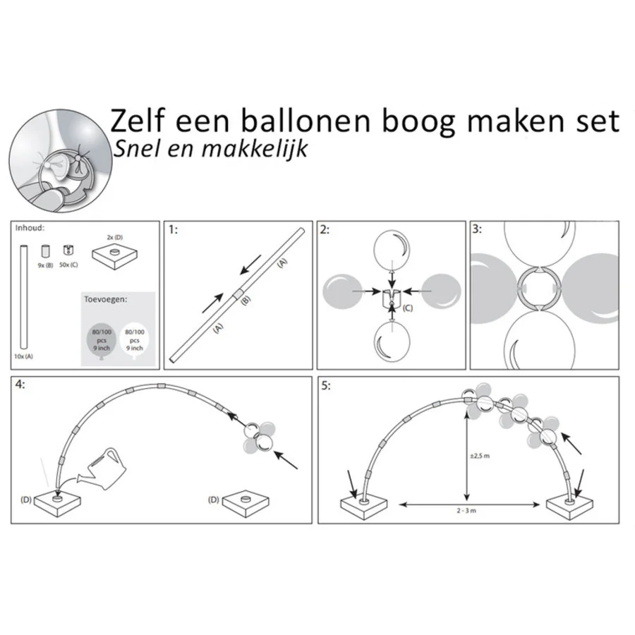 Een set om zelf snel en gemakkelijk een ballonnenboog te maken. In de set zitten 2 blokvoeten, 12 buizen, 11 tussenstukjes en 50 ringen. Zie andere foto. Perfect voor bruiloften, verjaardagen, kinderfeestjes, jubilea of andere themafeesten. De ballonnen kunt u er in iedere gewenste effen kleur bij bestellen. Er gaan ongeveer 130 ballonnen met een doorsnede van 27cm om de boog. Let op! Als de ballonnenboog binnen staat, blijven de ballonnen langer goed. De ballonnen zuil kunt u natuurlijk ook buiten neerzetten, maar dan raden wij aan de Chrome ballonnen te gebruiken, opdat dit speciale decoratie ballonnen zijn die buiten langer goed blijven.