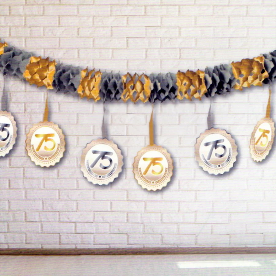 Een luxe papieren slinger met 75 jaar decoraties die bewerkt zijn met goudkleurige folie. Mooi voor iemand die 75 jaar is geworden. Lengte: 4 meter.