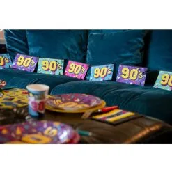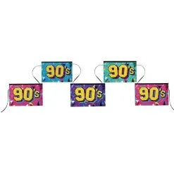 Een jaren 90 slinger. Perfect voor jaren 90 themafeesten. Ook leuk voor verjaardagen van mensen die in de jaren 90 zijn geboren. Afmeting vlaggetjes: 20cm x 13cm. Lengte: 5 meter. Materiaal: decoratie karton.