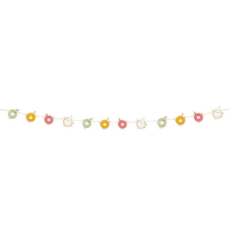 Een superleuke slinger met papieren decoraties van vrolijke donuts. Lengte: 3 meter. Leuk en feestelijk voor een kinderverjaardag.