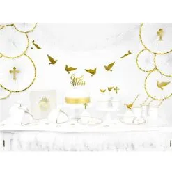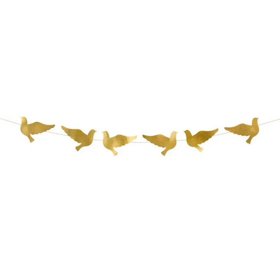 Een prachtige folieslinger in de vorm van goudkleurige duiven. Afmeting: 112cm x 8.1cm. Erg mooi en toepasselijk voor kerkdiensten, christelijke jongeren events, doopfeesten, bruiloften, verjaardagen of andere christelijke themafeesten.