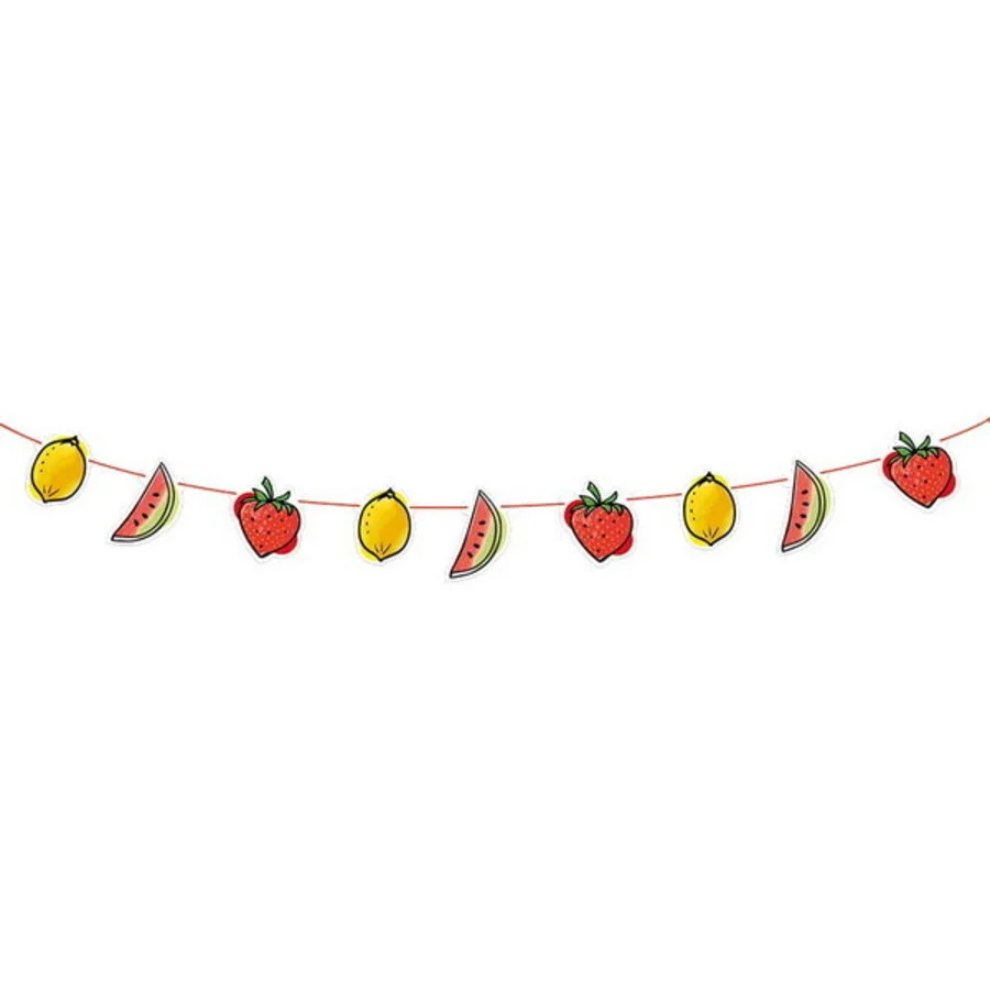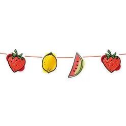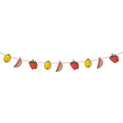 Een kartonnen slinger met fruit. Superleuk voor een zomers themafeest. Bekijk ook onze andere fruit en zomer decoraties. Lengte: 3 meter.