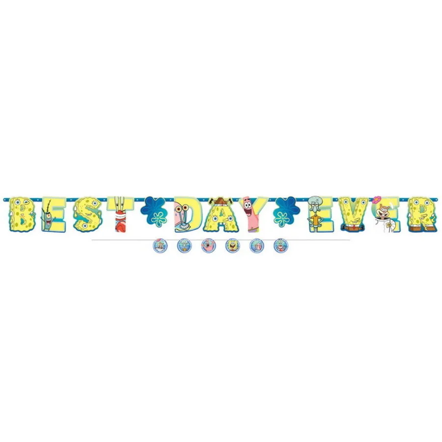 Een grote letterslinger bedrukt met Spongebob en zijn vrienden en de tekst: BEST DAY EVER. Plus een kleine slinger met decoraties van Spongebob en zijn vrienden. Afmeting grote slinger: 320cm x 25.4cm. Afmeting kleine slinger: 180cm x 10.1cm. Super tof voor een kinderverjaardag in het thema Spongebob Squarepants.