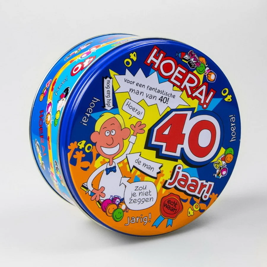 Een vrolijk bedrukte snoep-koekjes trommel voor een man die 40 jaar is geworden. Een zak snoep erin en u heeft u geweldig lekker cadeau! Doorsnede: 14cm.