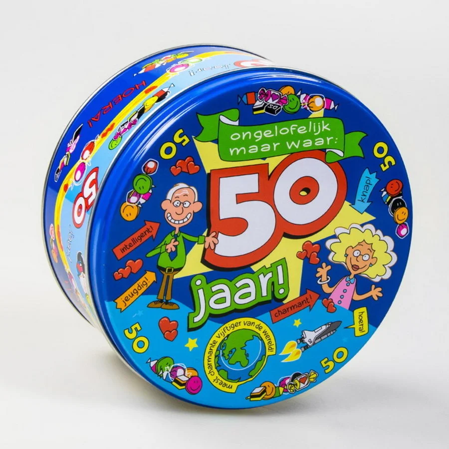 Een vrolijk gekleurde snoeptrommel met leuke teksten en tekeningen. Tekst: Ongelofelijk maar waar. 50 jaar! Doorsnede: 14cm.