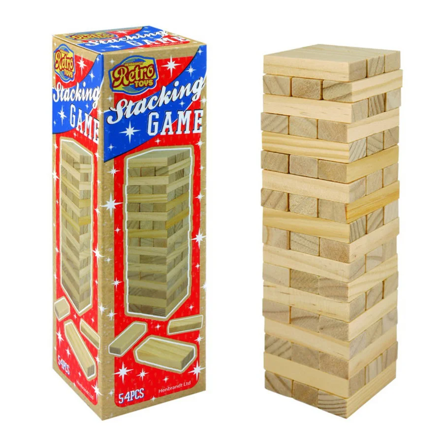 Bouw de toren zo hoog mogelijk en laat de blokken niet vallen! Haal vervolgens om en om één voor één een blokje eruit. Laat ook nu de toren niet in elkaar storten. Degene die de toren laat vallen verliest. Inhoud: 54 houten blokjes. Afmeting: 5cm x 1cm. Compacte versie, dus handig mee te nemen. Geschikt voor kinderen vanaf 3 jaar.