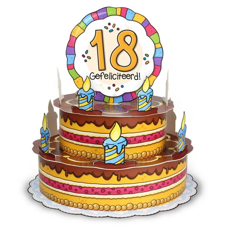 Kaarten heb je in alle soorten en maten maar dit is wel echt een heel bijzonder exemplaar. Deze prachtige luxe 3D kaart, die je zelf eenvoudig in elkaar kunt zetten, is namelijk een heuse verjaardagstaart! Bovenop de taart zit dan een decoratie met de tekst: 18 gefeliciteerd. Leuk om met een groep collega’s, vrienden of familie aan de 18 jarige te geven. Wil je een leuke slinger ophangen voor de jarige, dan hebben wij een ruime keuze voor je. Bekijk onze collectie hier.