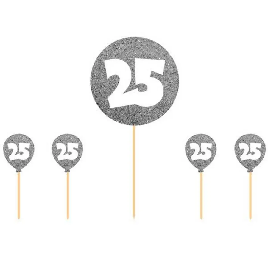 Een 5-delige set taartdecoraties 25 jaar. Vier kleine prikkers en een grote prikker met een glitter decoratie voor iemand die 25 jaar wordt of bijvoorbeeld voor een 25 jarig huwelijk. Schitterend voor op de taart of in luxe hapjes.