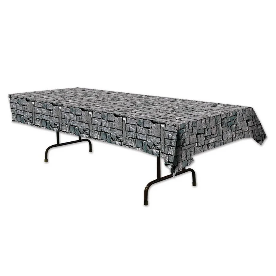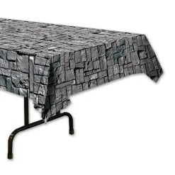 Een groot plastic tafelkleed van een stenen kasteelmuur voor op tafel tijdens een kinderverjaardag. Je kunt dit tafelkleed ook als achtergrond aan de wand hangen. Leuk om bijvoorbeeld mooie foto’s te maken met een passende achtergrond als herinnering aan het ridderfeestje. Afmeting: 137cm x 274cm.