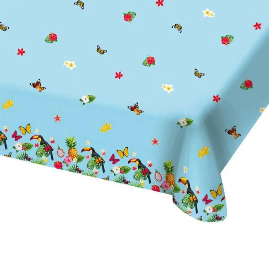 Een tropische feestje vieren is natuurlijk erg leuk. Weer of geen weer, toch een zomerse sfeer ;). De tafel kleed je ook in stijl aan door middel van dit tropische tafelkleed bedrukt met toekans, ananassen, vlinders en andere tropische afbeeldingen. Het tafelkleed is gemaakt van plastic en heeft een ruime afmeting van 180 x 130 cm. Naast dit tafelkleed zijn er ook bordjes, bekertjes en servetten verkrijgbaar in dit zomerse thema.