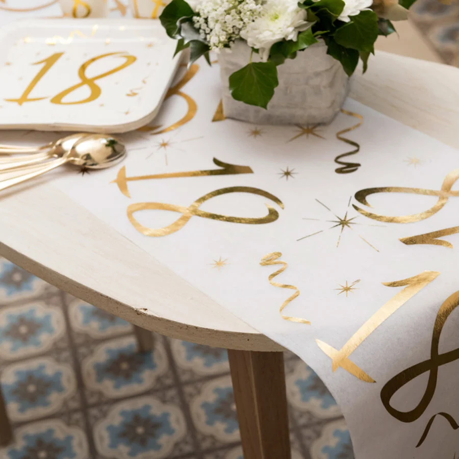 Een witte stoffen tafelloper bedrukt met goudkleurige cijfers 70 en serpentine slingers. Afmeting: 30cm x 5m. Prachtig voor op tafel tijdens een 70 jaar verjaardag of jubilea.