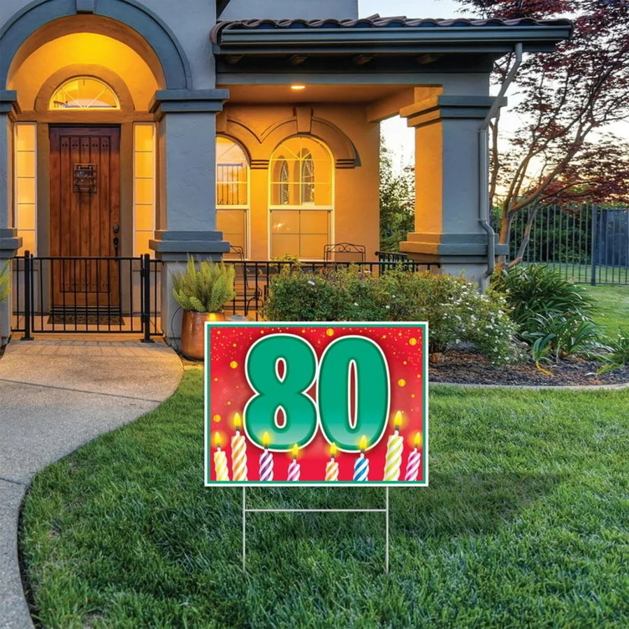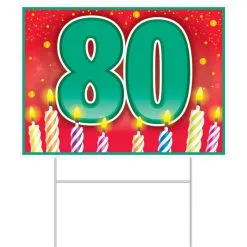 Een vrolijk gekleurd sterk kunststoffen tuinbord bedrukt met het getal 80 en verjaardagkaarsjes. Afmeting: 29cm x 39cm. Heeft u geen tuin? Geen probleem! Zet deze originele decoratie in twee bloempotten of emmers met zand. Bekijk de extra foto’s voor meer informatie.