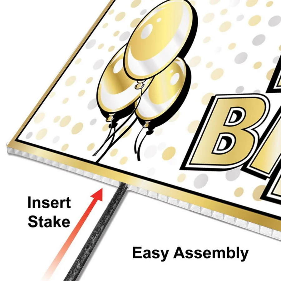 Een super origineel sterk kunststoffen tuinbord bedrukt met de tekst Happy Birthday en ballonnen.
