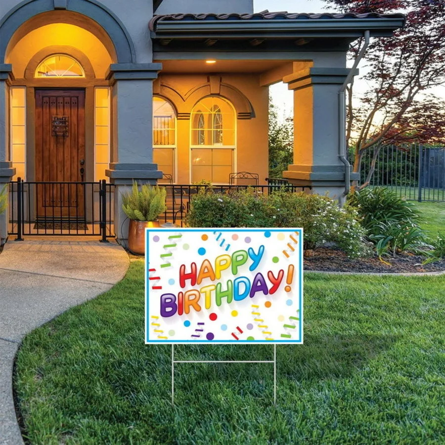 Een vrolijk gekleurd sterk kunststoffen tuinbord bedrukt met Happy Birthday en confetti.