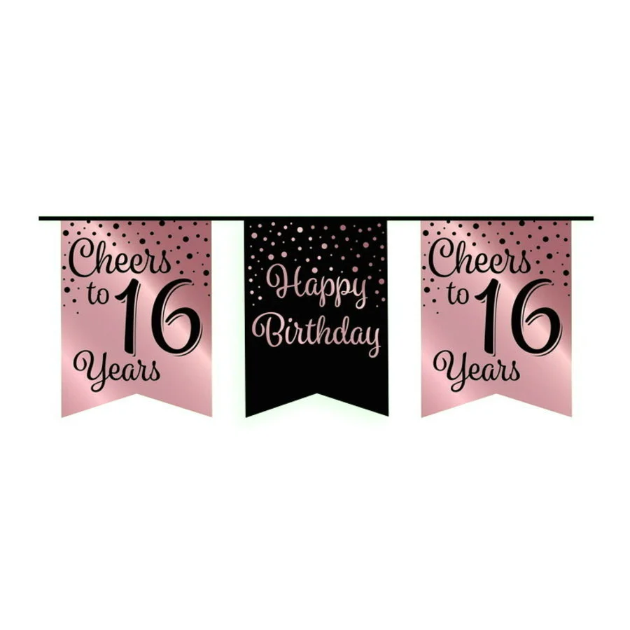 Een prachtige luxe vlaggenlijn voor iemand die 16 jaar is geworden. Kleur: rosé-zwart. Dubbelzijdig bedrukt. Een feestelijk slinger met op het ene vlaggetje ‘Happy Birthday’ en op de ander ‘Cheers to 16 Years’ Wij hebben een grote collectie versiering voor de 16 jarige, in sweet sixteen style of met vrolijke kleurtjes.